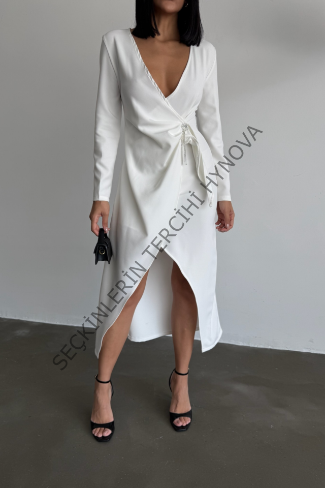 KRUVAZE BROŞ DETAYLI ELBİSE - Beyaz