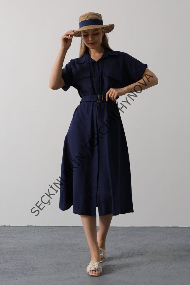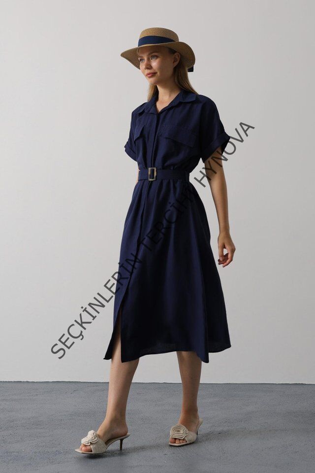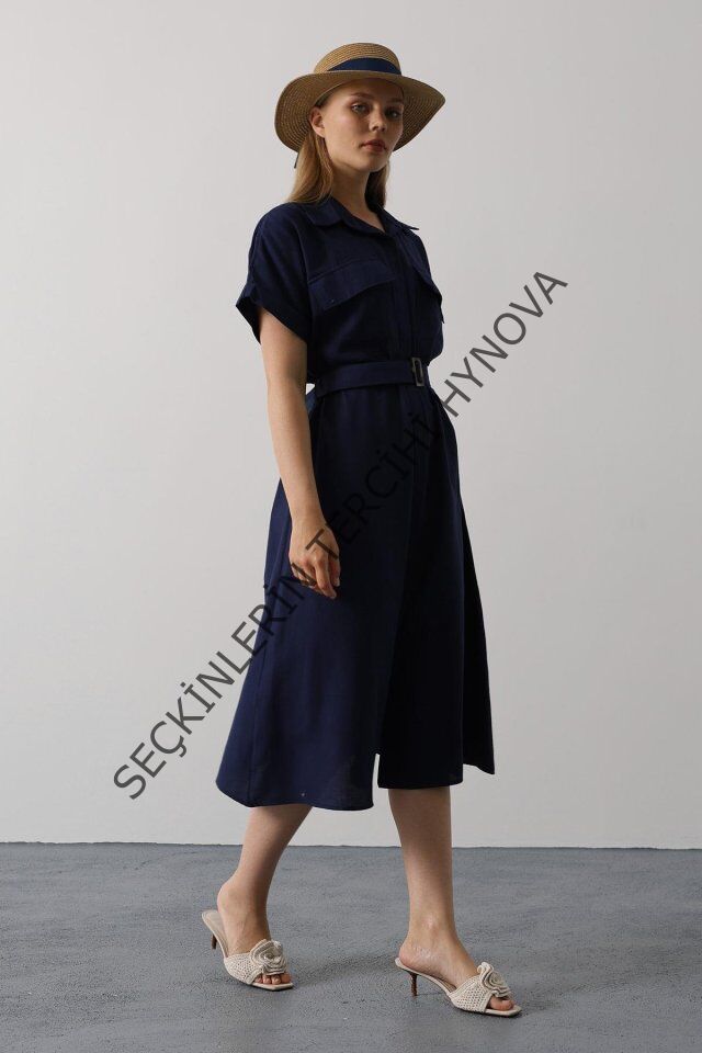 Kuşaklı Cep Detaylı Yarım Kol Elbise - Lacivert