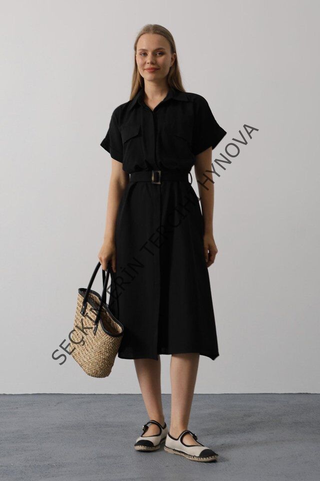 Kuşaklı Cep Detaylı Yarım Kol Elbise - Siyah
