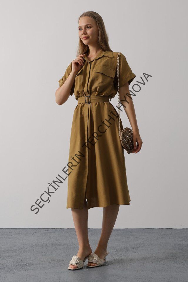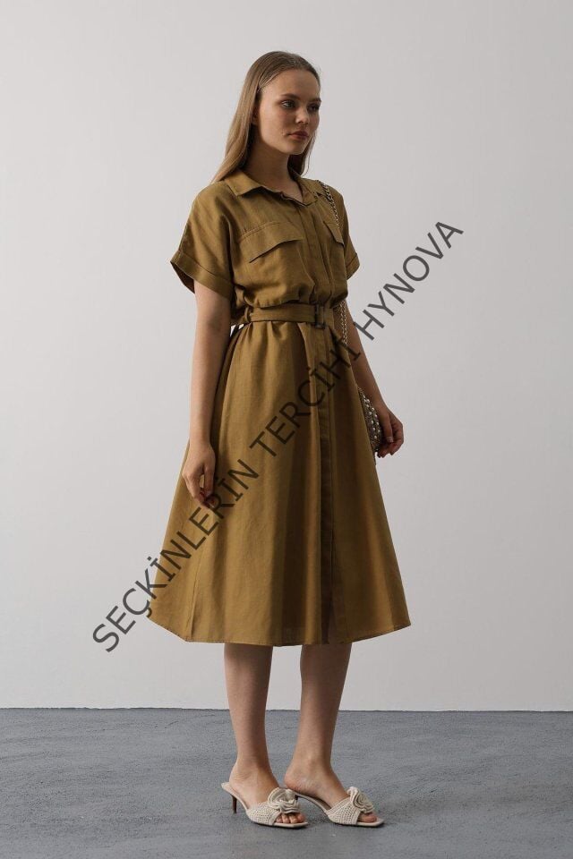 Kuşaklı Cep Detaylı Yarım Kol Elbise - Yağ Yeşili