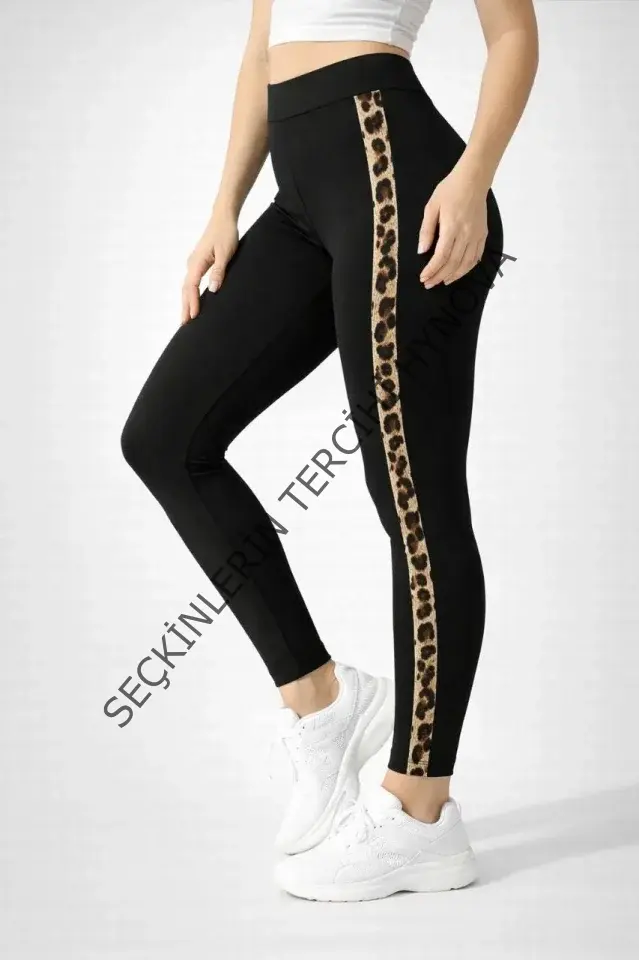 Likralı Yan Leopar Şeritli Detaylı Tayt - Siyah