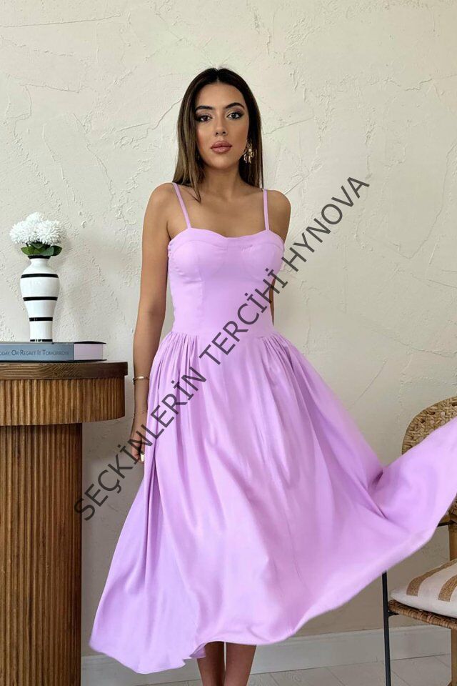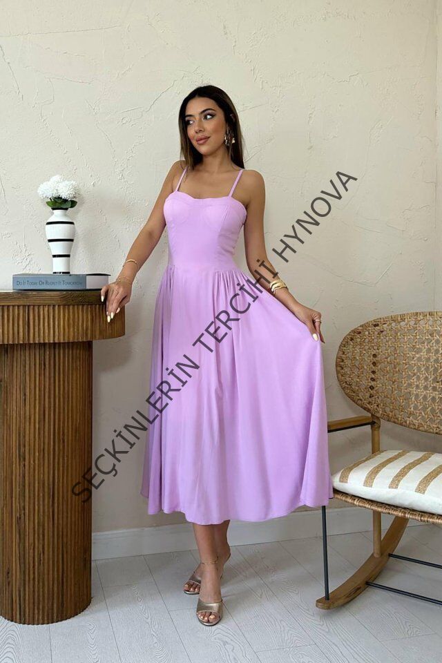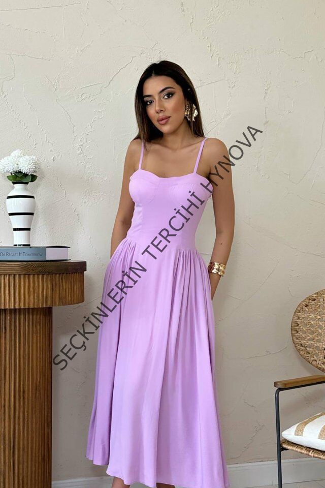 Lila Göğüs Kuplu Uzun Büzgülü Elbise