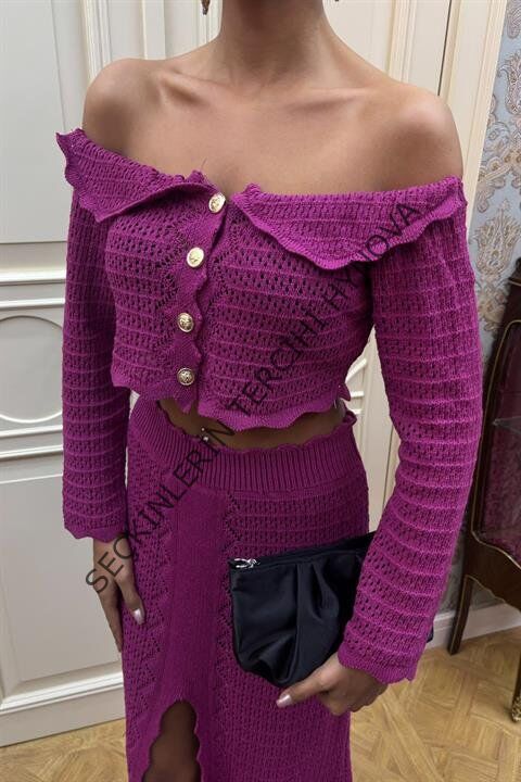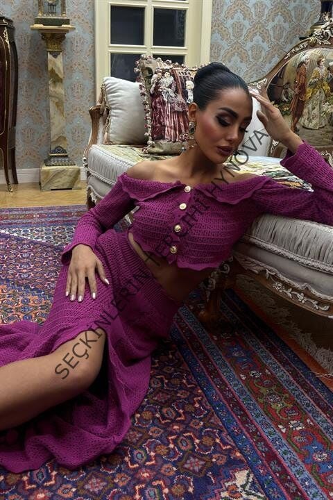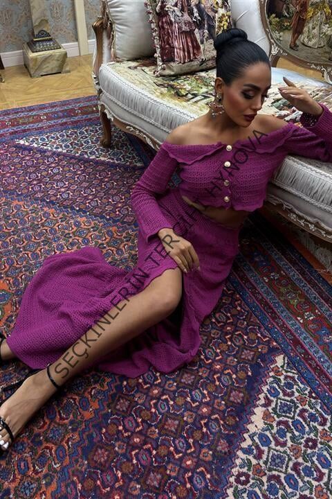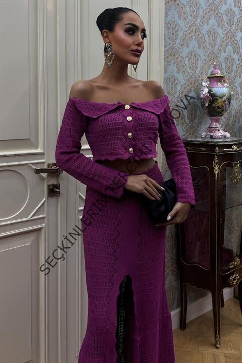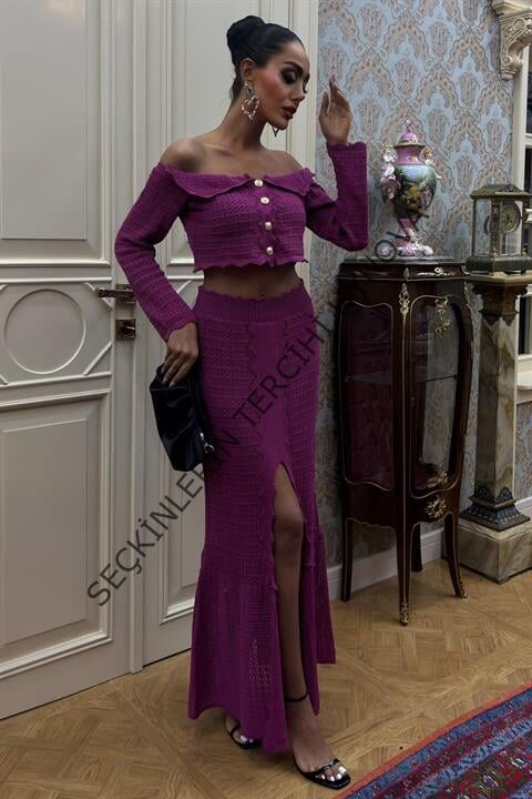 Madonna Yaka Derin Yırtmaç Etekli Şık Triko Takım 10099