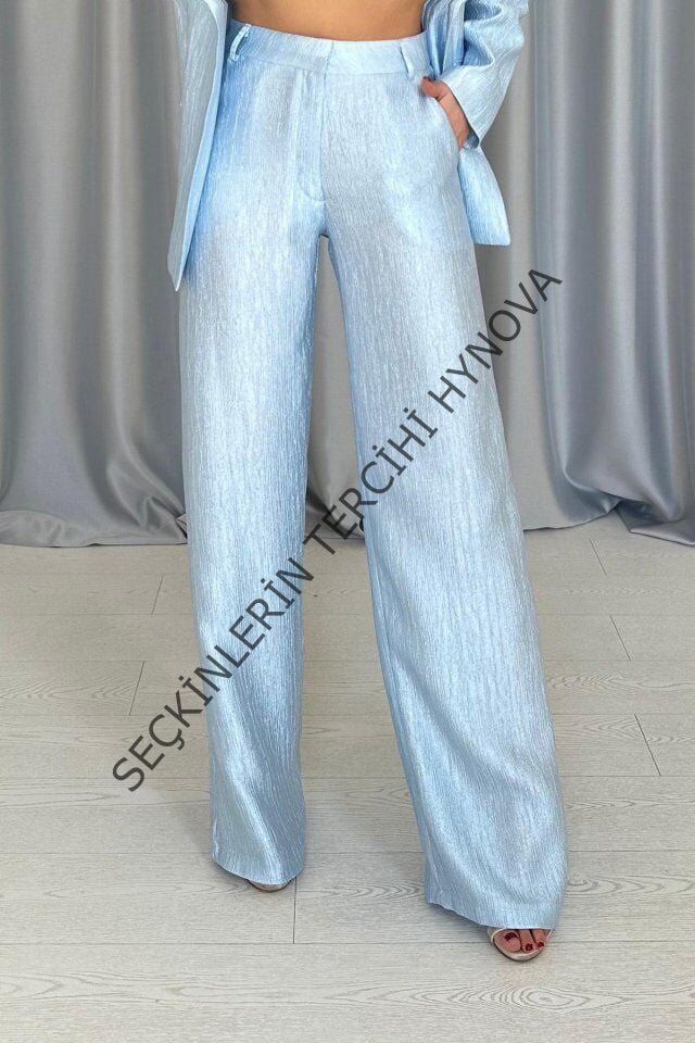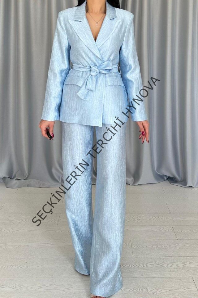Mavi Beli Kuşaklı Ceket Ve Pantolon Parlak Takım