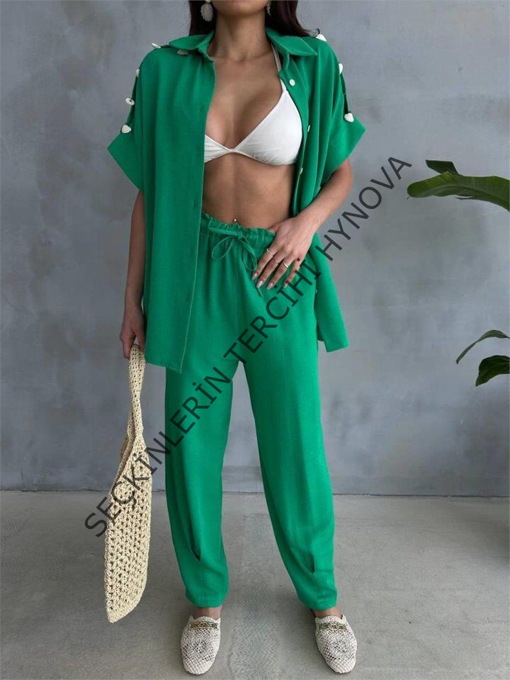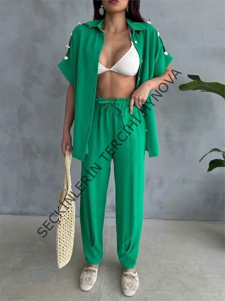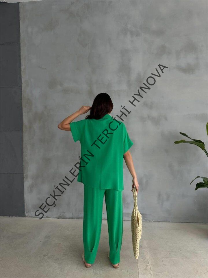 OMUZ MİDYE SIRALI BLUZ - PAÇA PENSLİ PANTOLON TAKIM - Yeşil