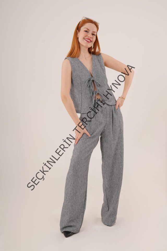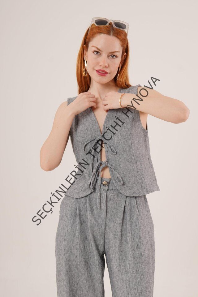Ön Bağlama Detaylı Yelek Ve Pantolon Antrasit İkili Takım