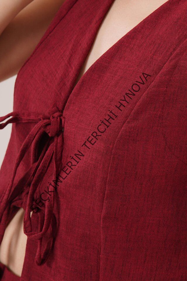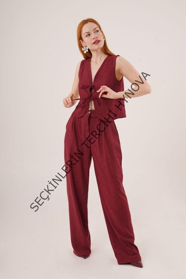 Ön Bağlama Detaylı Yelek Ve Pantolon Bordo İkili Takım