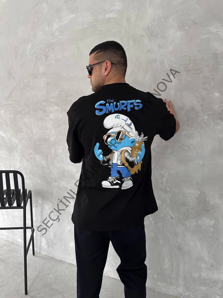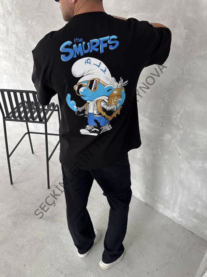 Ön Ve Arka Baskılı Oversize Bisiklet Yaka T-shirt- Siyah