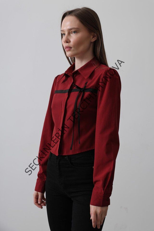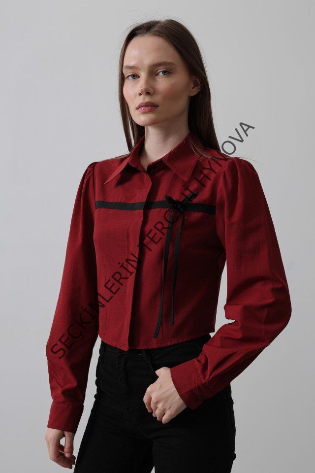 Önü Kontrast Fiyonklu Gömlek - Bordo