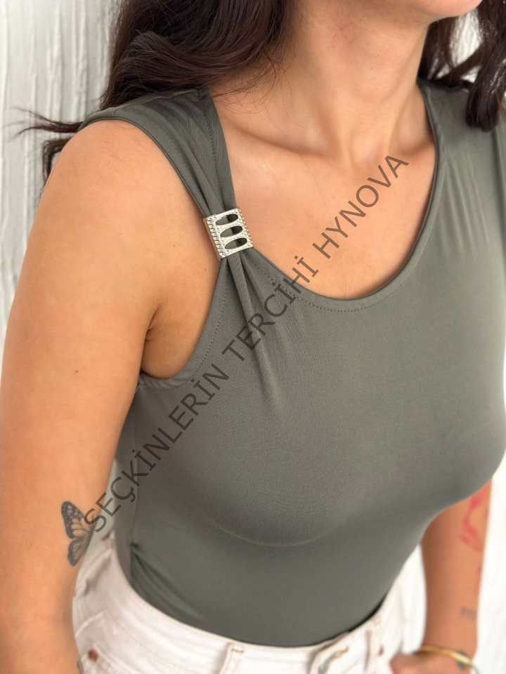 Osy Modal Yumuşak Dokulu Kumaş Bisiklet Yaka Sıfır Kol Bluz Omuz Toka Aksesuar Detaylı - Haki