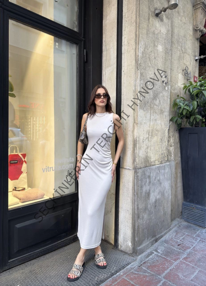 Osy Modal Yumuşak Dokulu Kumaş Bisiklet Yaka Sıfır Kolsuz Yırtmaçlı Uzun Elbise - Beyaz