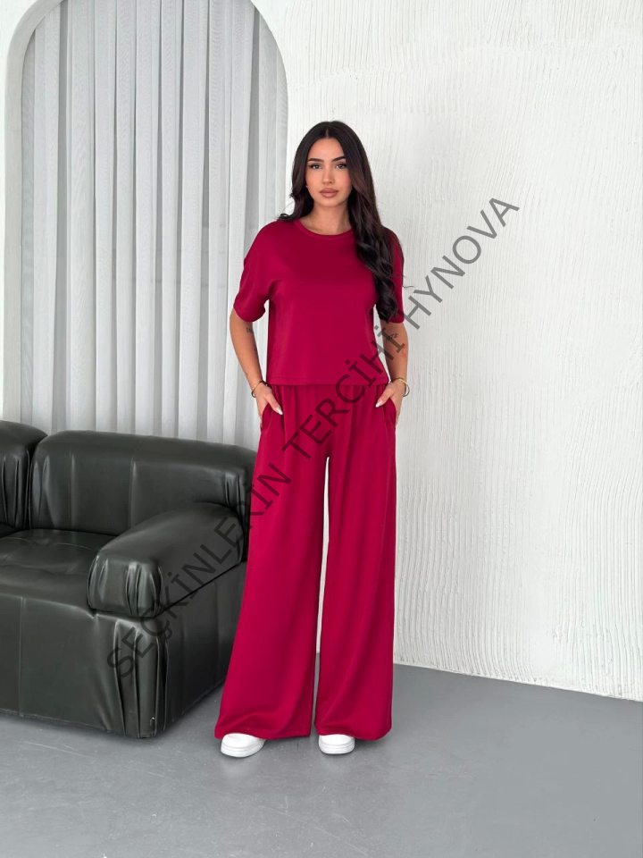 Osy Modal Yumuşak Dokulu Kumaş Bisiklet Yaka T-shirt Bol Paça Pantalon Ikili Takım -Bordo