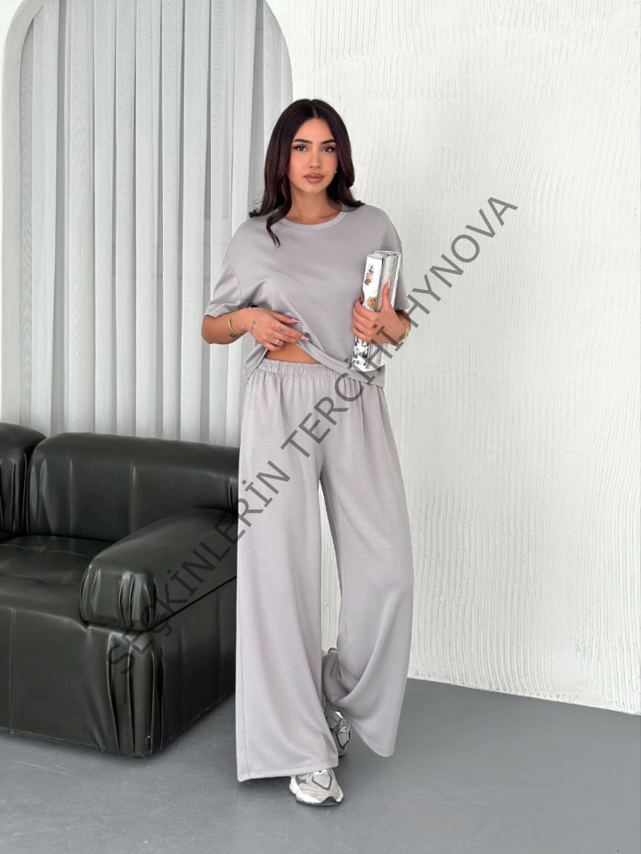 Osy Modal Yumuşak Dokulu Kumaş Bisiklet Yaka T-shirt Bol Paça Pantalon Ikili Takım - Boyalı Gri