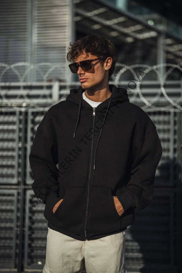 Oversize Tam Fermuarlı Uzun Kol Hırka - Siyah