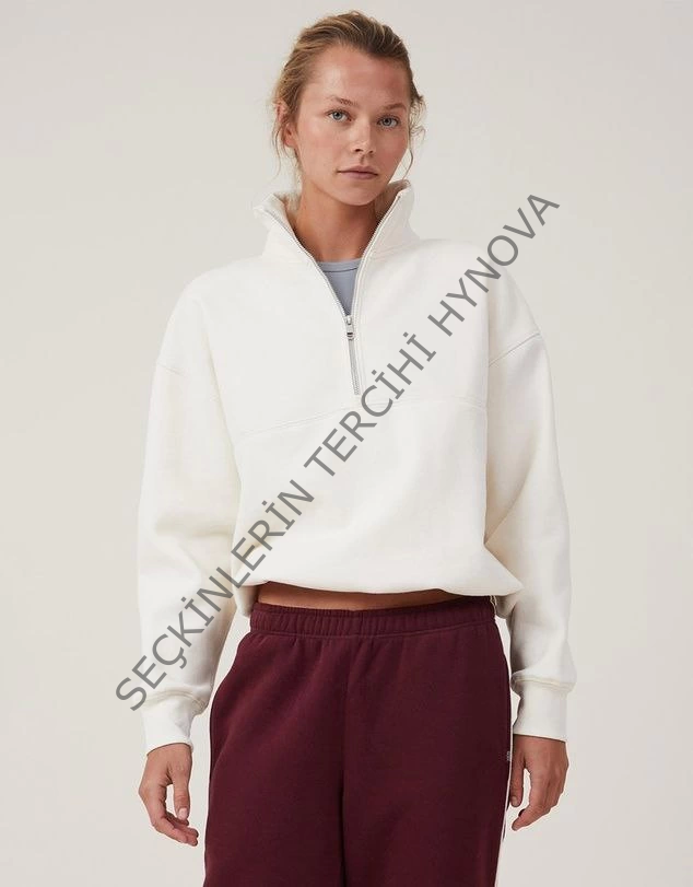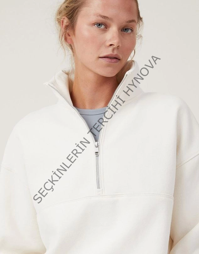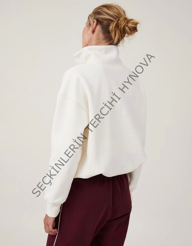 Oversize Yarım Farmuarlı Yakalı Basic SweatShirt - Beyaz