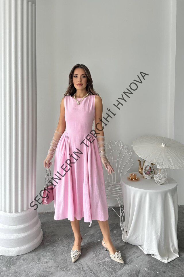 Pembe Yanları Büzgülü Midi Boy Keten Elbise