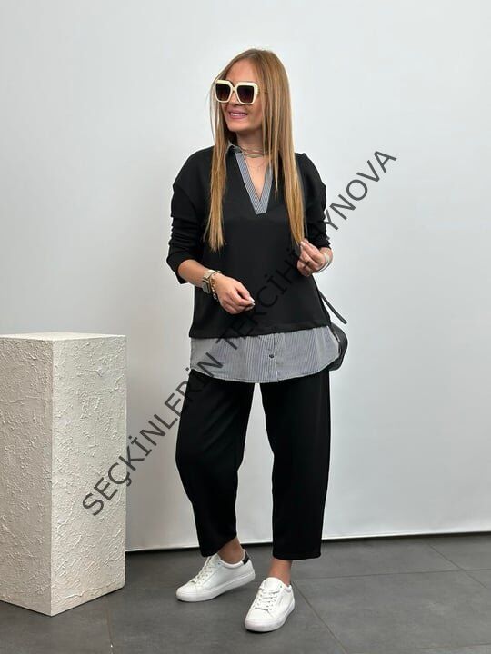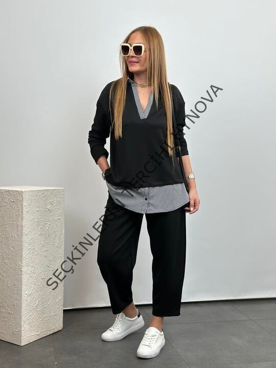 Polo Yaka Gömlek Detay Salaş Balon Pantolunlu ıkılı Takım