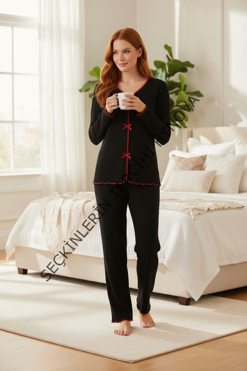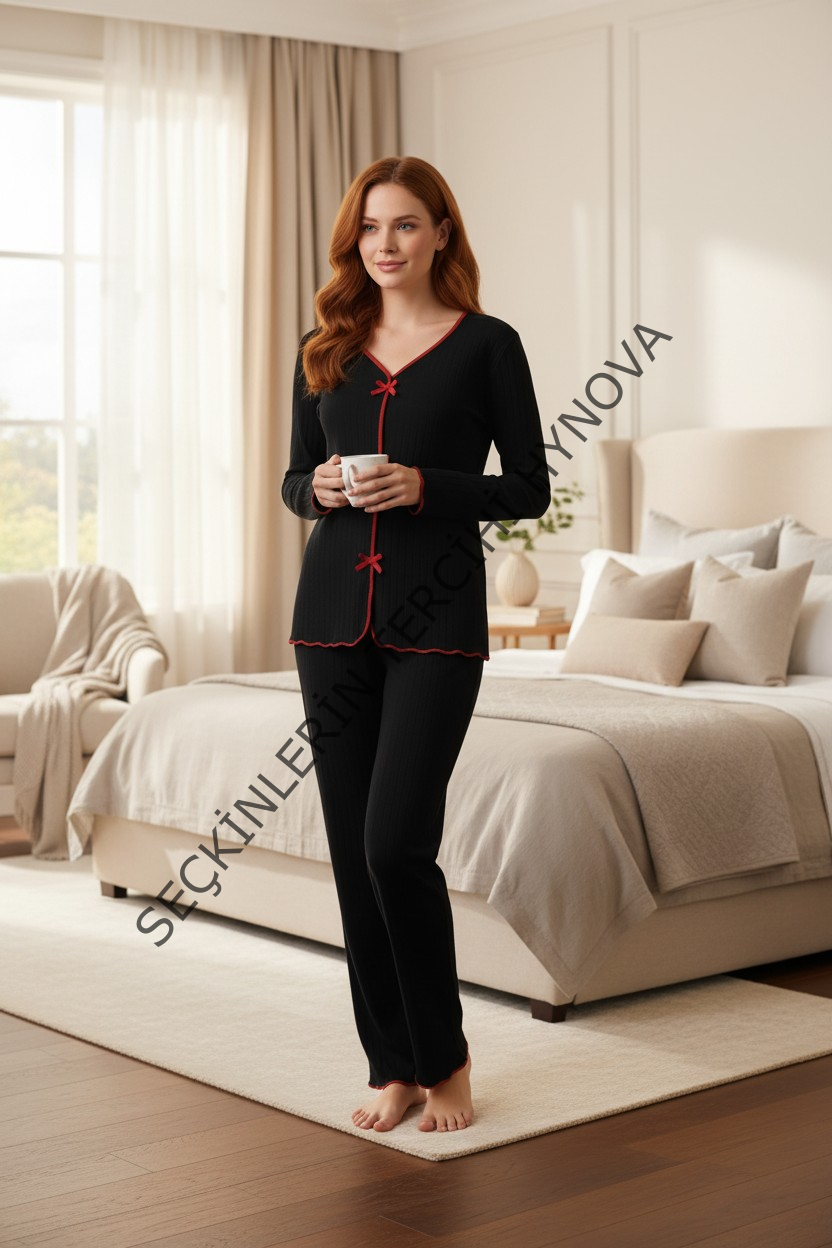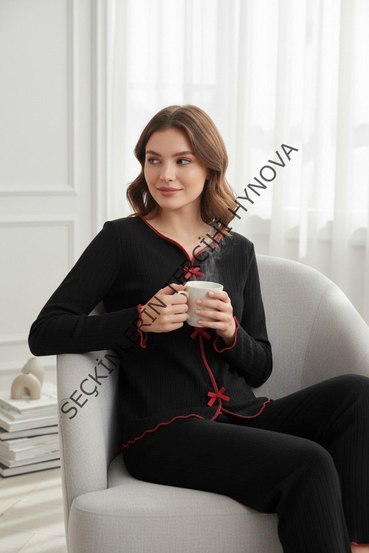Premium Kadın 4’lü Fitilli Set – Siyah Kırmızı Biyeli (Pijama Üst, Pantolon, Bikini Takımı)