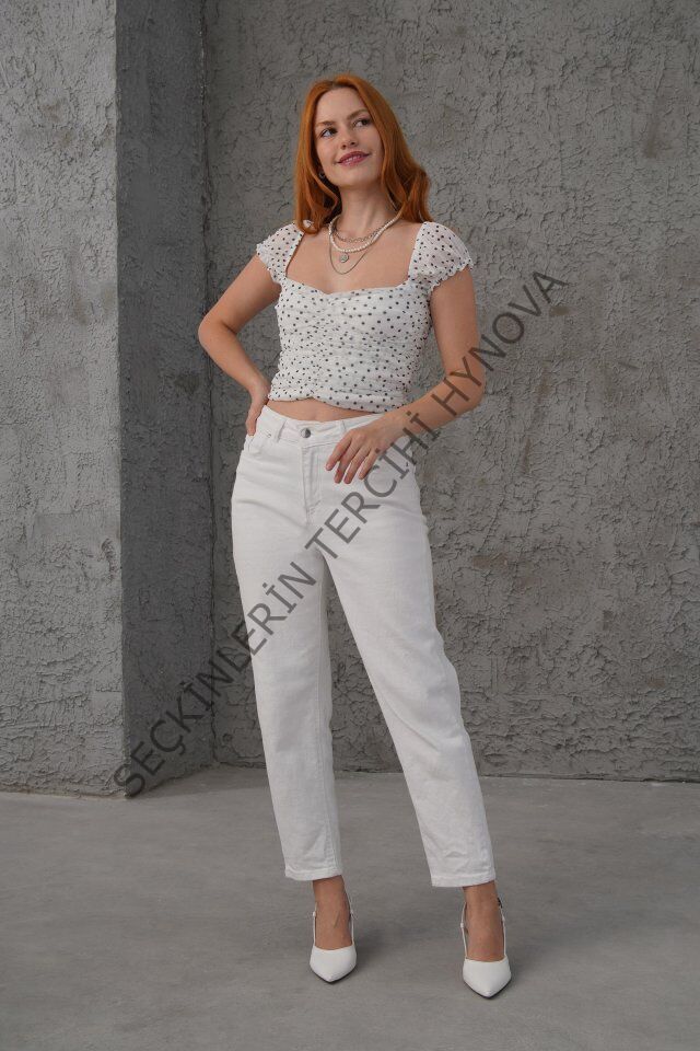 Puantiyeli Belden Oturtmalı Tül Beyaz Bluz