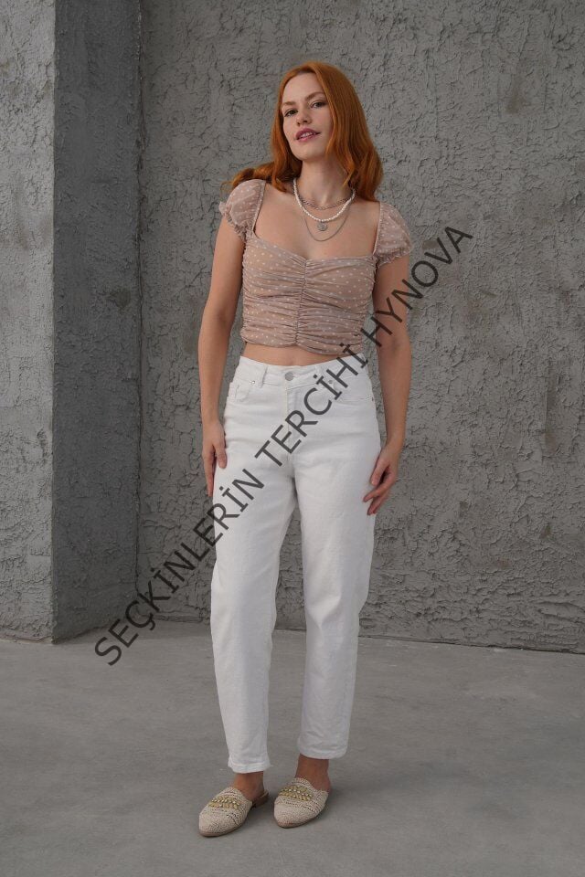 Puantiyeli Belden Oturtmalı Tül Krem Bluz