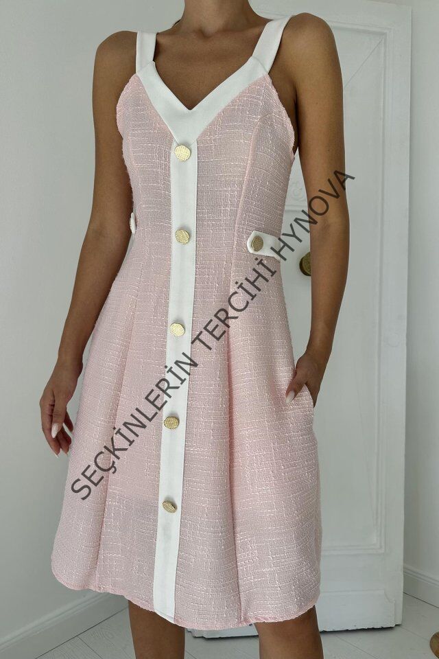 Pudra Ekru Süs Cepli Askılı Elbise