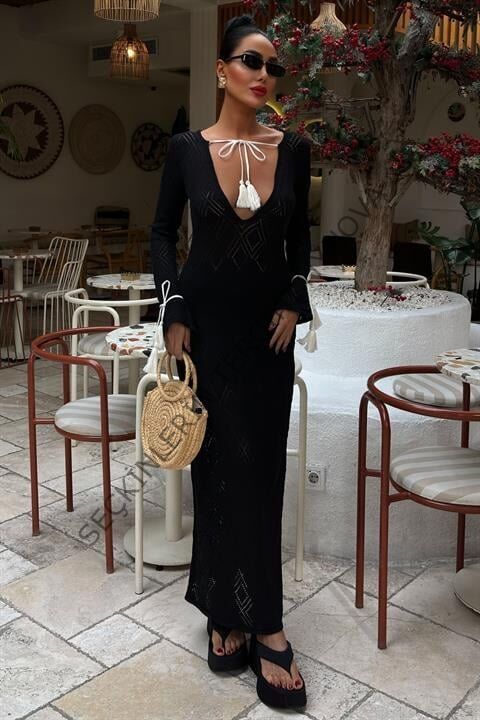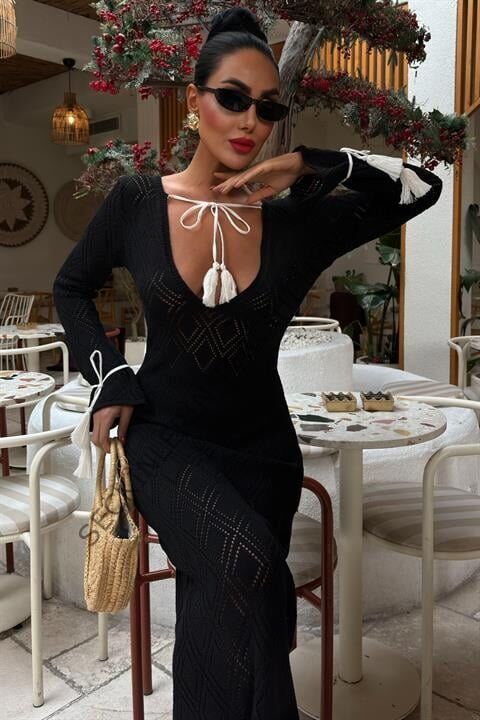 Püskül Bağcık Detaylı V Yaka Ajurlu Elbise 2850