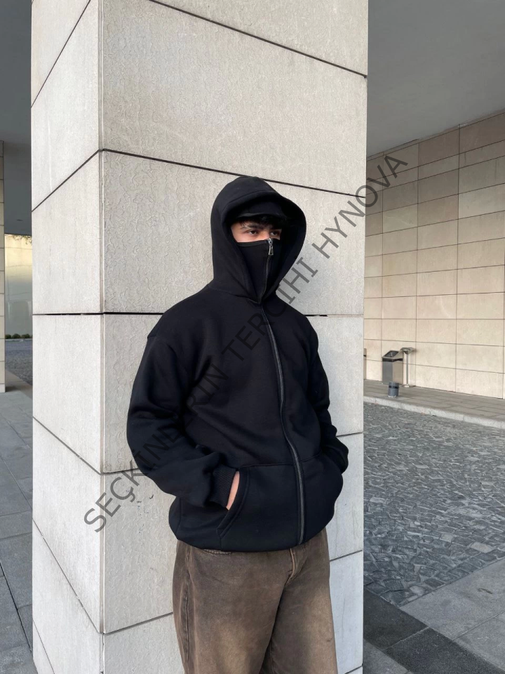 Samuray Kapüşonlu ZIP Fermuarlı Kapüşonlu SweatShirt - Siyah
