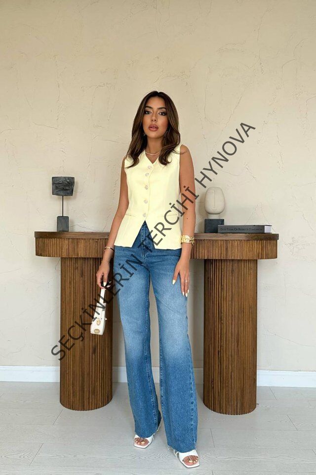 Sarı Belden Oturtma Detaylı Düğmeli Yelek