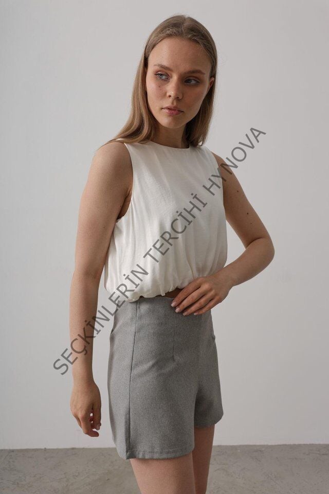 Saten Kolsuz Belki Lastikli Bluz - Ekru