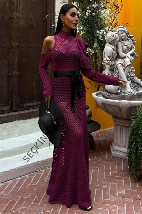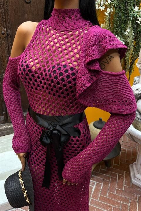 Saten Kuşaklı Ajurlu Triko Elbise 2847
