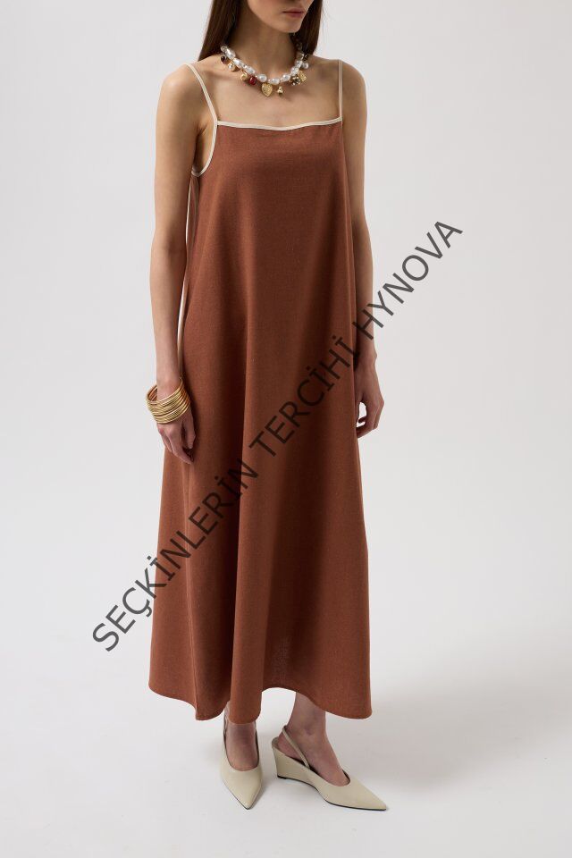 Şerit Detay Keten Maxi Elbise