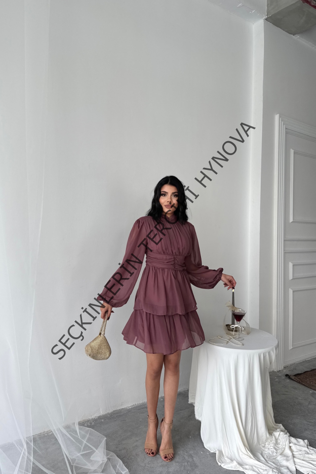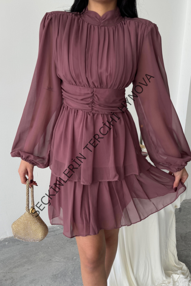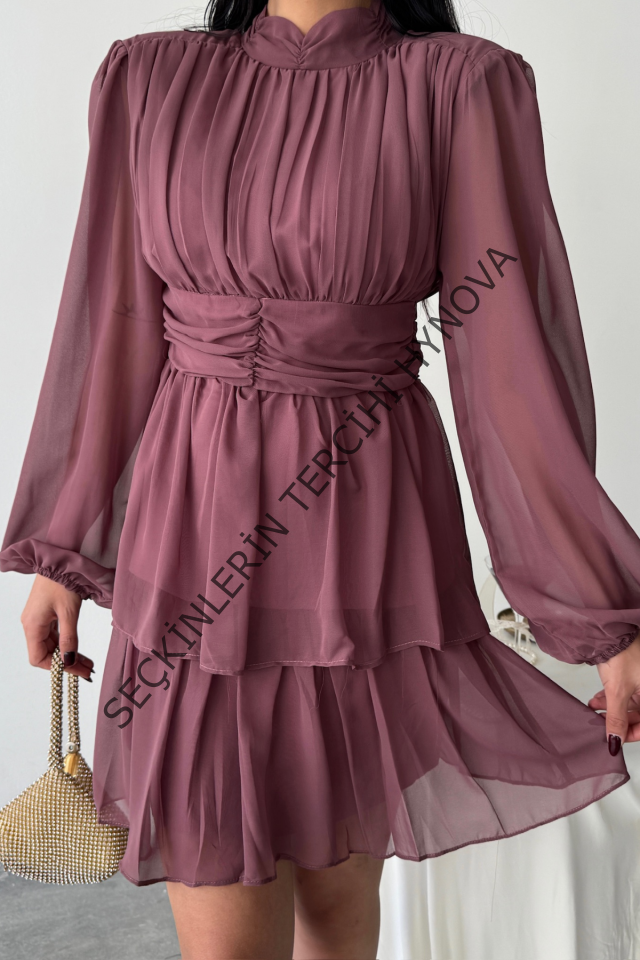 ŞİFON KATLI UZUN KOL ELBİSE - Pudra