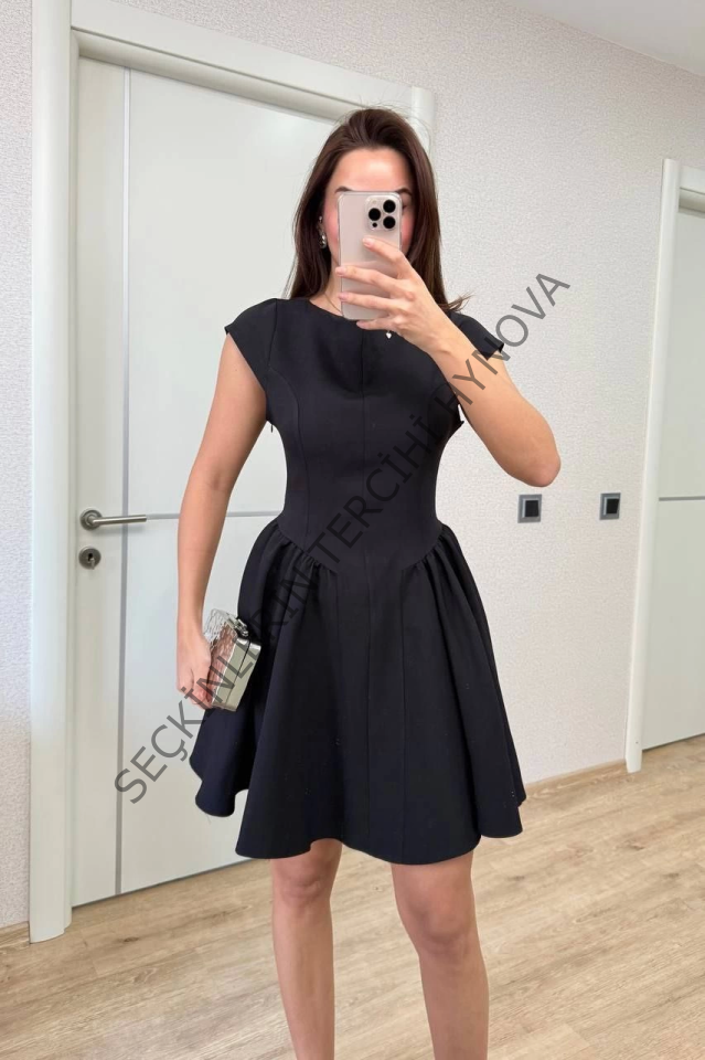 Sırt Dekolteli Çan Detaylı Mini Elbise - Siyah