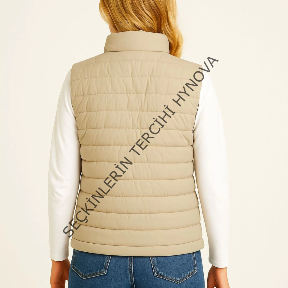 Şişme Fermuarlı Yelek Su Itici Kapitone Astarlı Kumaş Cepli Hafif Kışlık Spor Rahat Kalıp - Bej