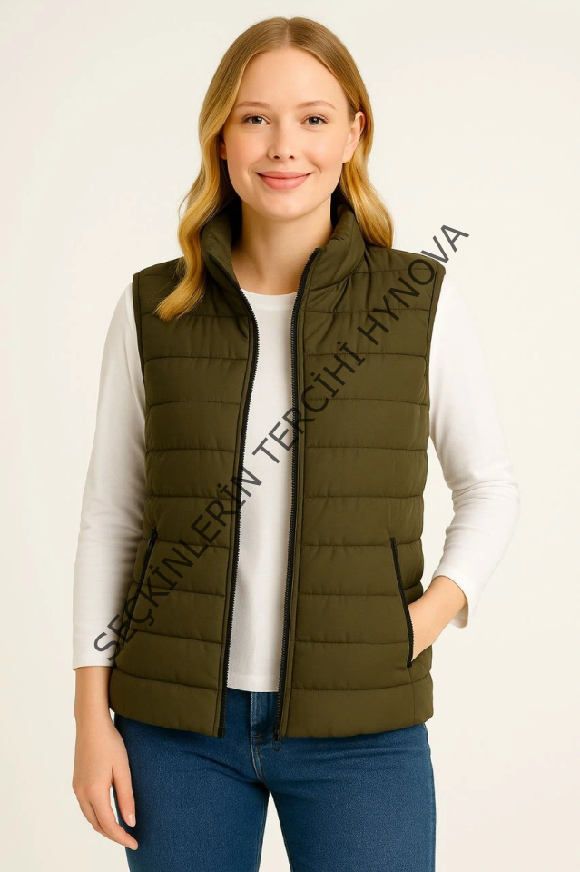 Şişme Fermuarlı Yelek Su Itici Kapitone Astarlı Kumaş Cepli Hafif Kışlık Spor Rahat Kalıp - Haki