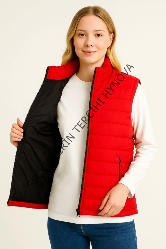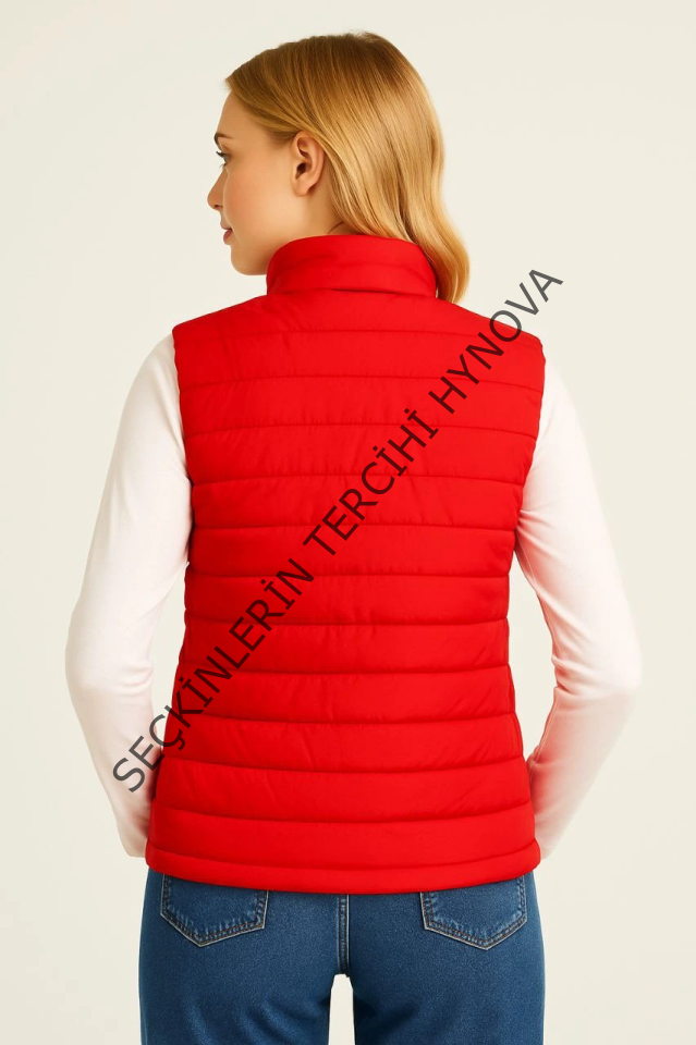 Şişme Fermuarlı Yelek Su Itici Kapitone Astarlı Kumaş Cepli Hafif Kışlık Spor Rahat Kalıp - Kırmızı