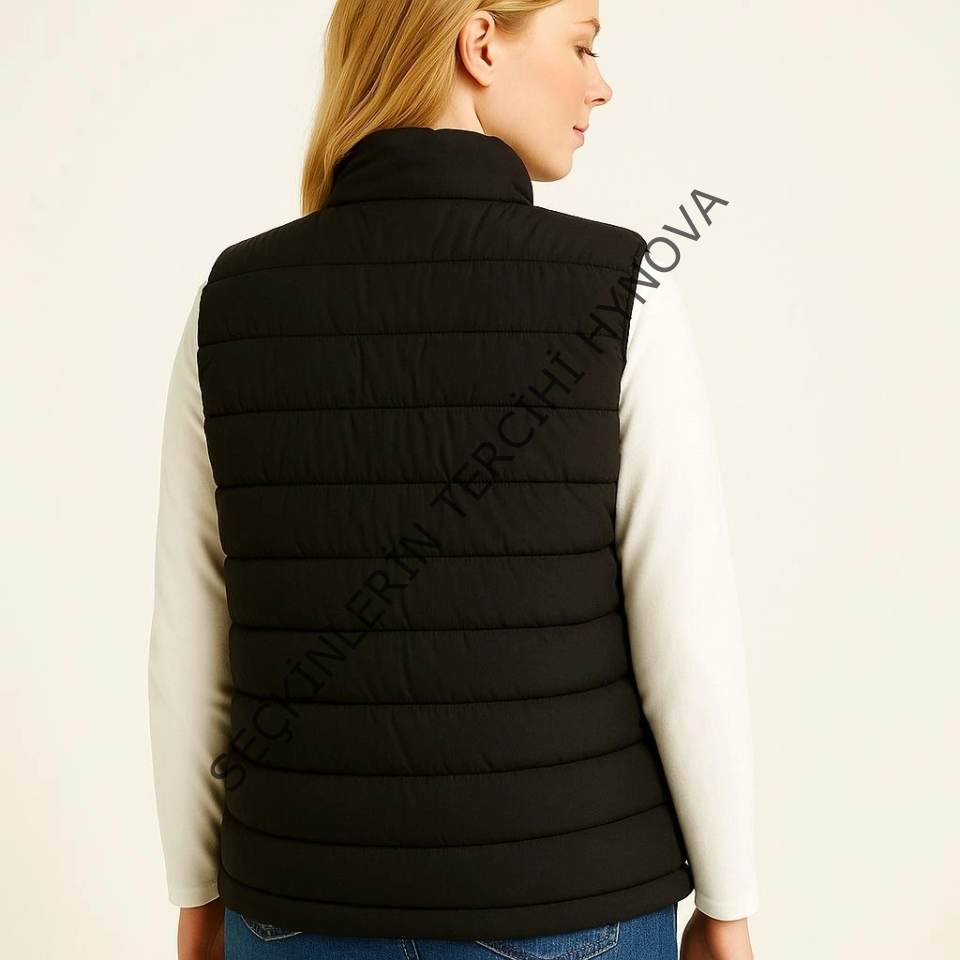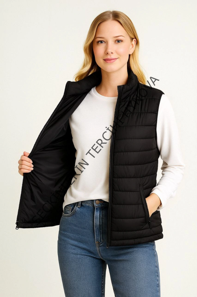 Şişme Fermuarlı Yelek Su Itici Kapitone Astarlı Kumaş Cepli Hafif Kışlık Spor Rahat Kalıp - Siyah