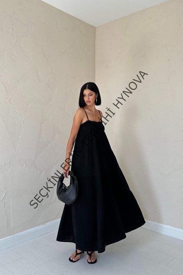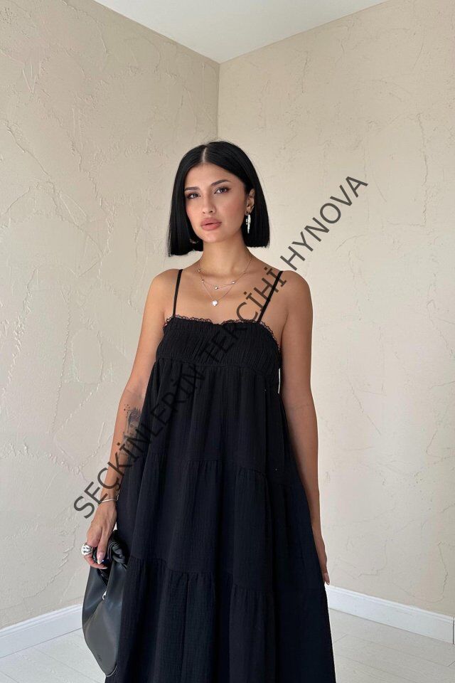 Siyah Askılı Parçalı Müslin Elbise