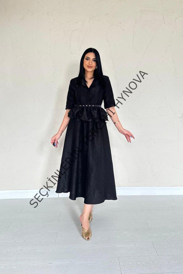 Siyah İnce Kemerli Fırfırlı Ceket Ve Büzgülü Etek Takım