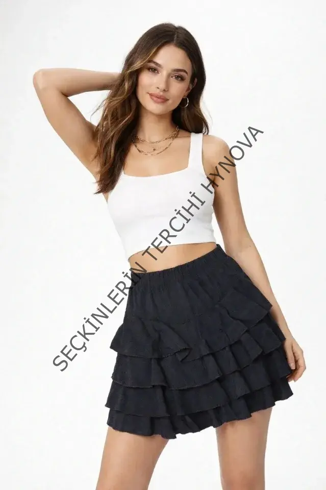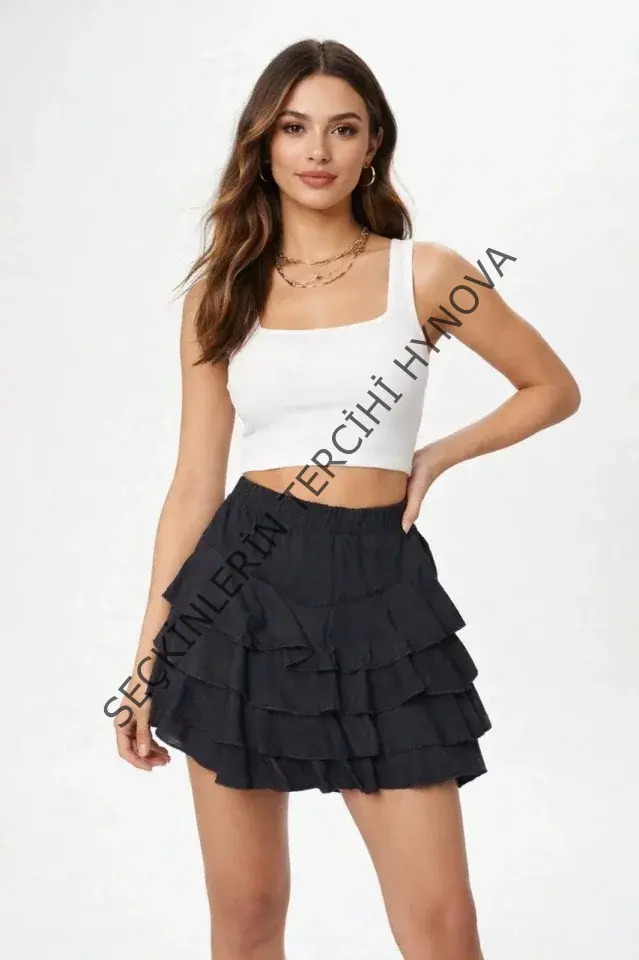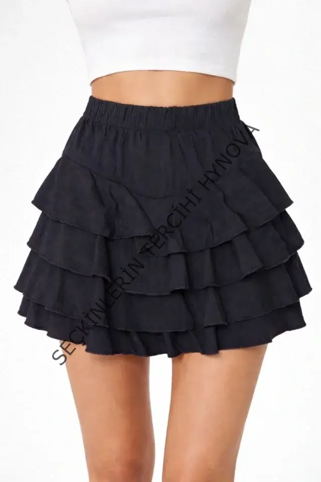 Siyah Katlı Mini Fırfıtlı Etek Lastikli Yüksel Bel, Volanlı Tasarım, Rahat Kalıp, Günlük Ve Şık Kombinelere Uygun Yazlık Etek - Siyah