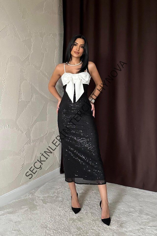 Siyah Önü Fiyonklu Garnili Elbise