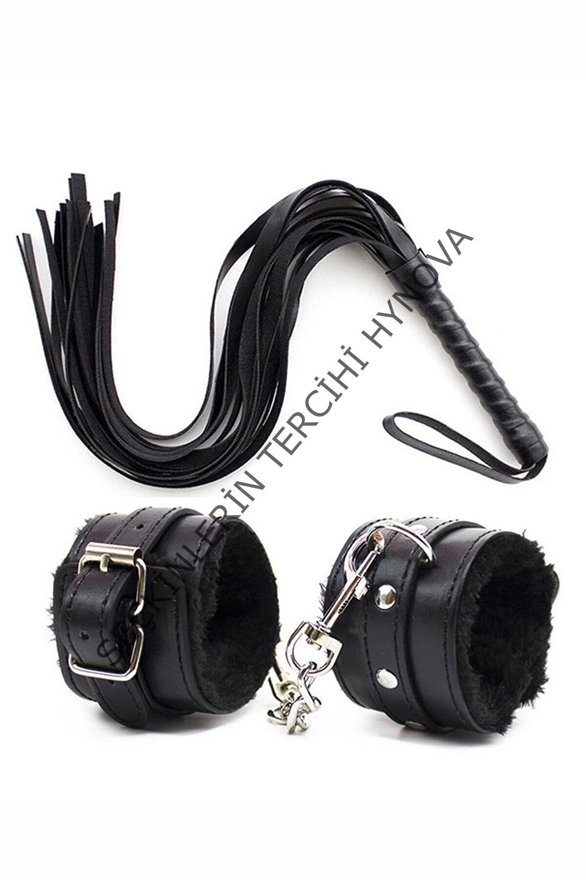Siyah Peluş Kelepçe ve Kırbaç Seti