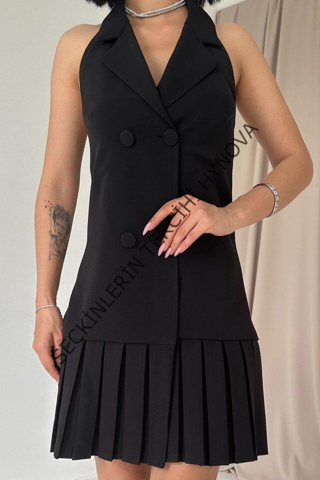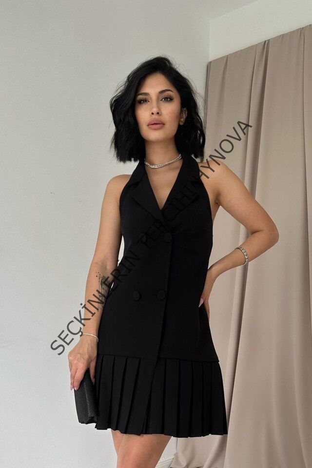 Siyah Sırtı Açık Ceket Yakalı Elbise