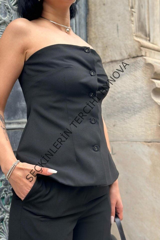 Siyah Straplez Düğmeli Crop Ve Pantolon Takım
