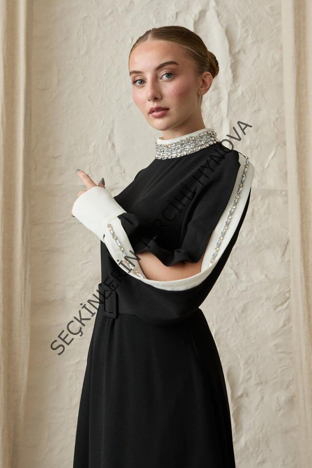 Siyah Yaka Ve Kolları Taşlı Elbise