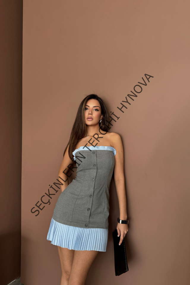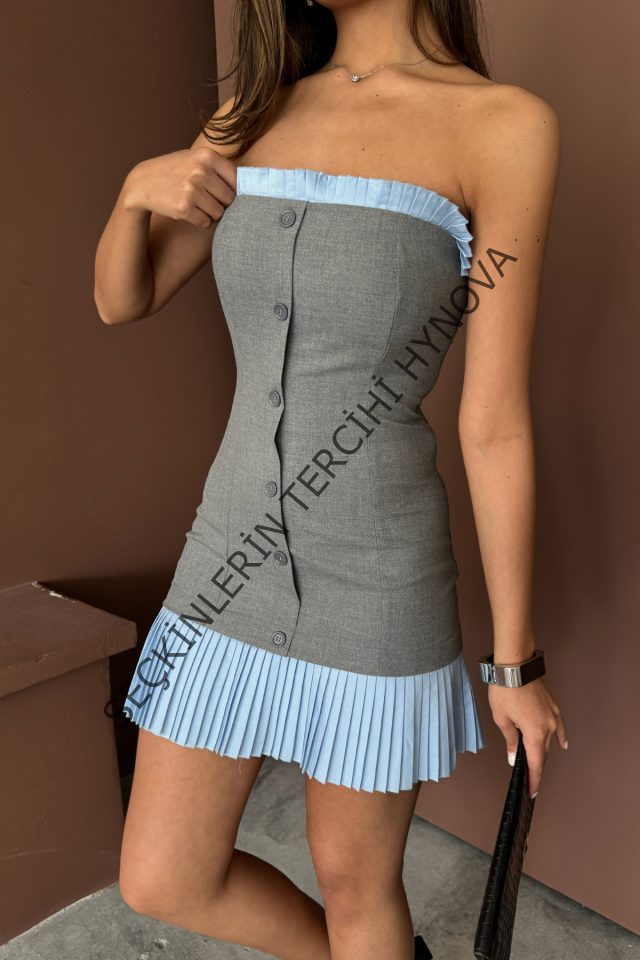 STRAPLEZ POLVİSKON ELBİSE MAVİ FIRFIR DETAYLI - Gri