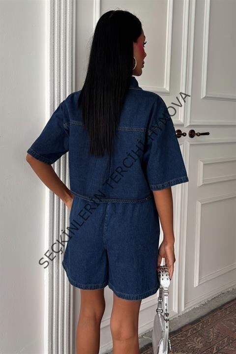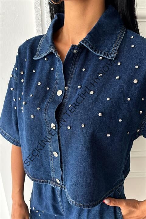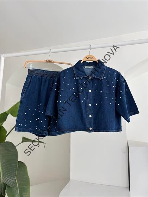 Taş Detaylı Gömlek Şort Denim Takım 10175