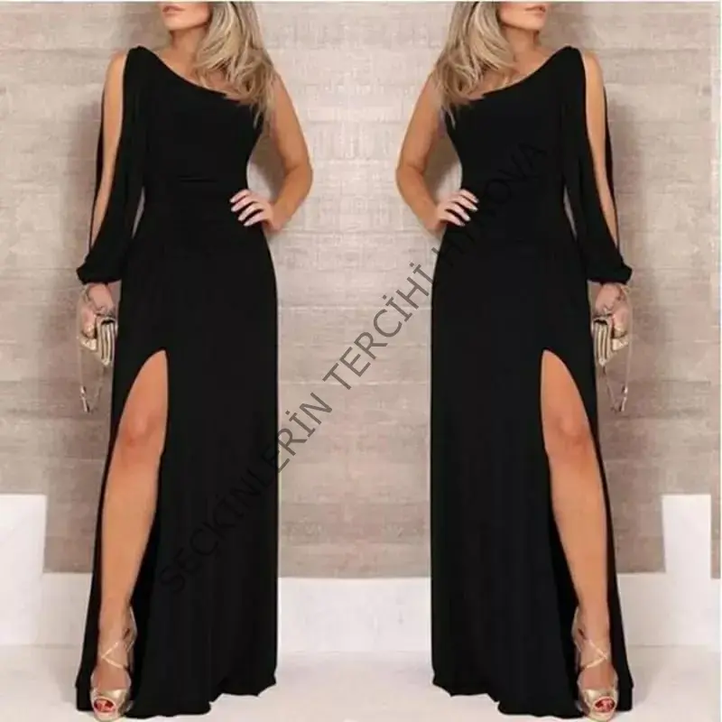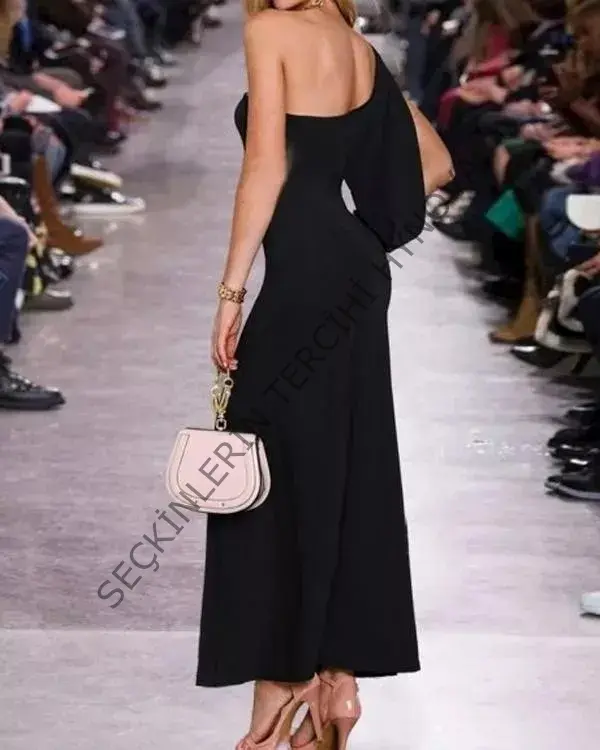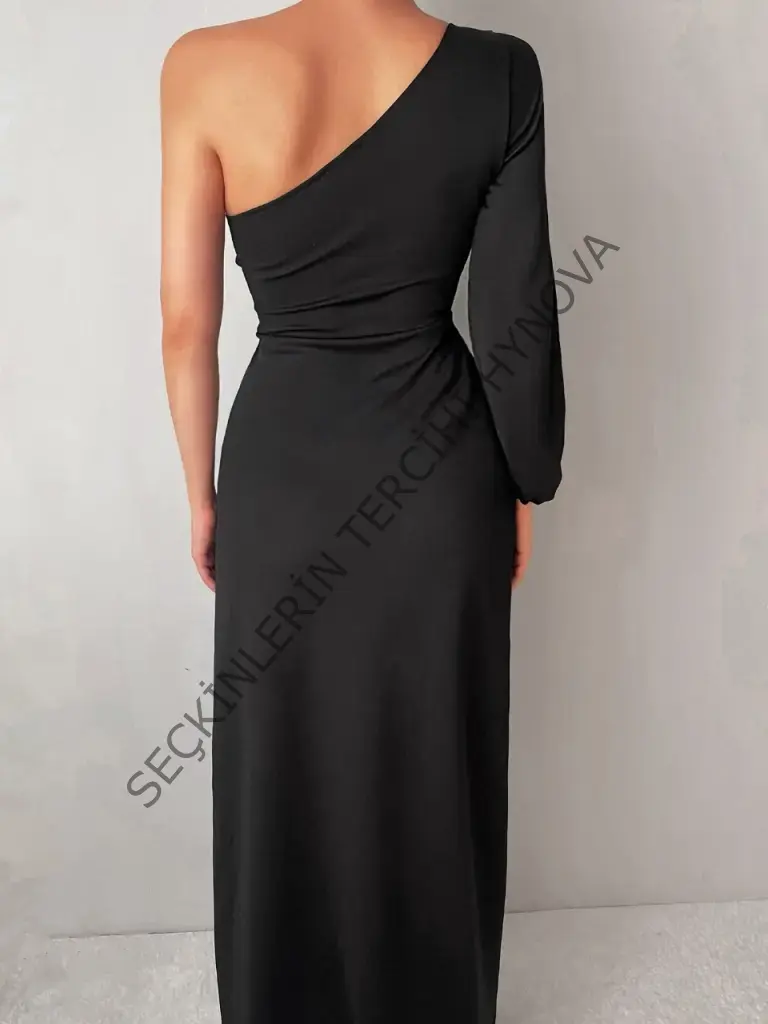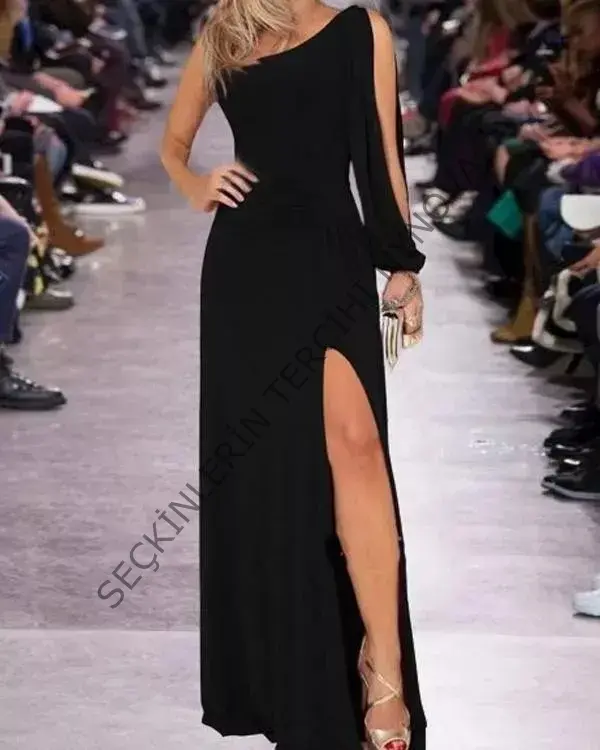 Tek Omuz Açık Derin Yırtmaçlı Krep Tam Boy Elbise