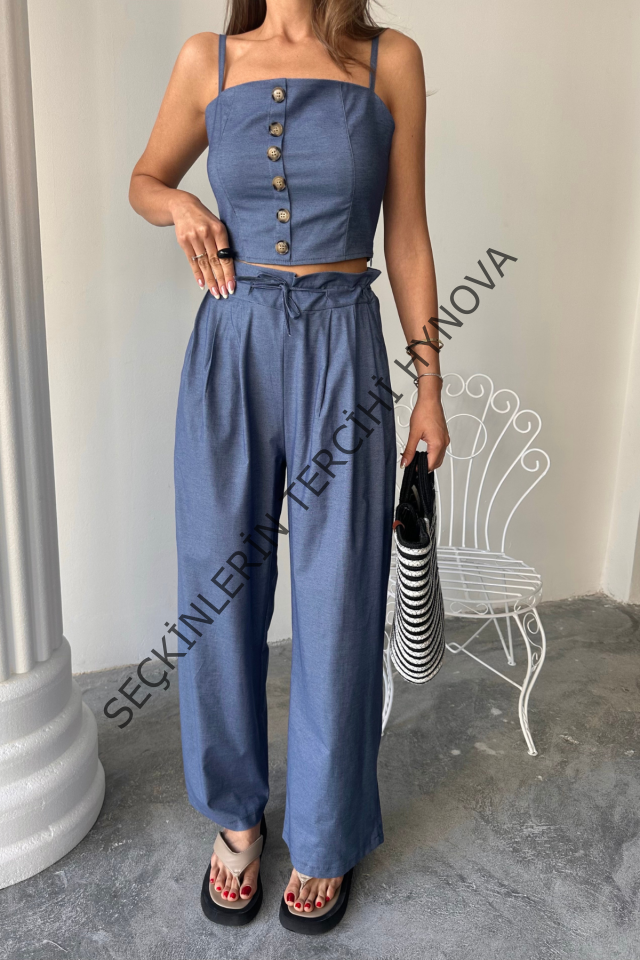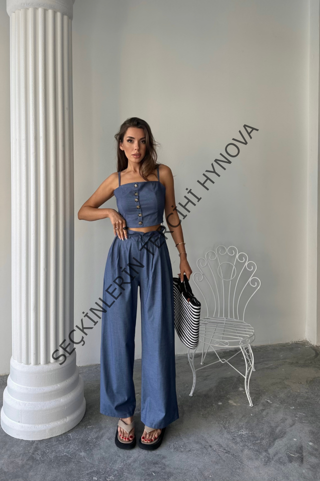 TENCEL CROP ASKILI BLUZ - ŞALVAR PANTOLON TK - İndigo