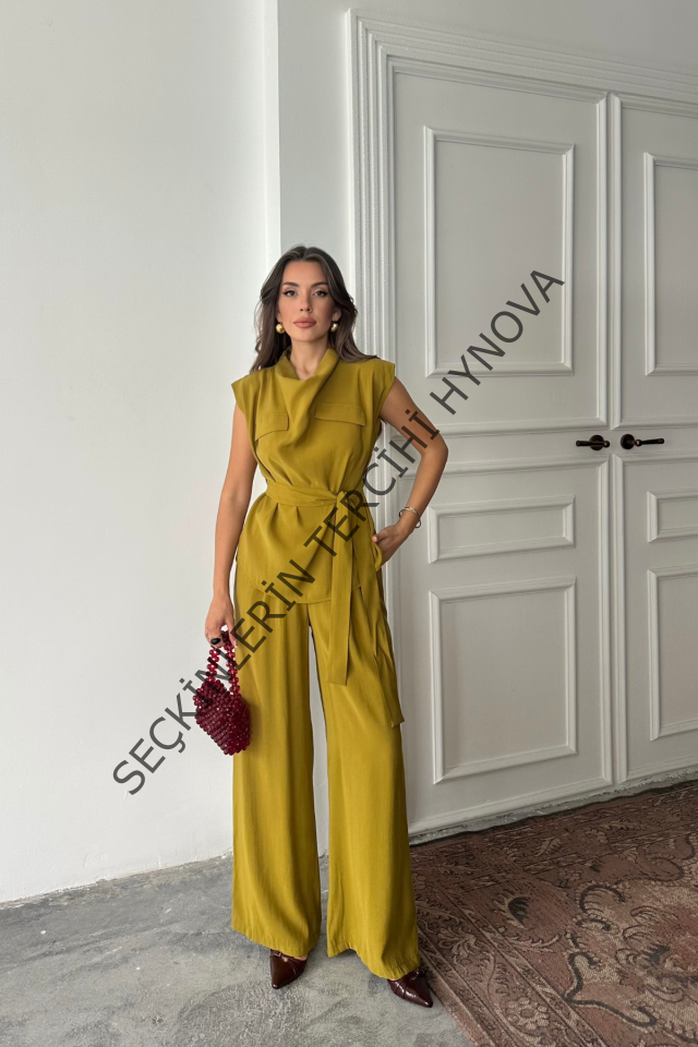 TENCEL MODAL KOLSUZ BLUZ KAPALI CEP DETAYLI DÖKÜMLÜ - PANTOLON TAKIM - Yağ Yeşili